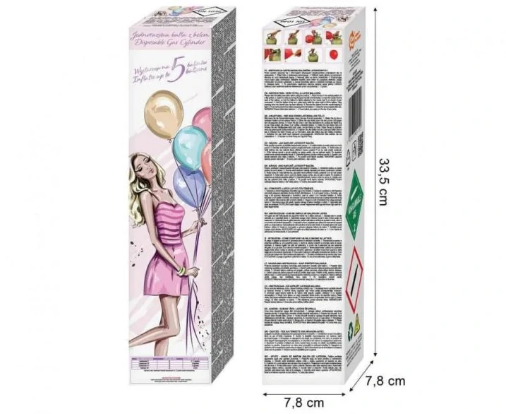 Návod na použití : Nádoba je vybavena ventilem, pro snadné nafouknutí balónků ihned po vyjmutí z kartonu. Odšroubujte bezpečnostní krytku a našroubujte trysku na nádobu. Otevřete zelený ventil otočením proti směru hodinových ručiček. Vložte trysku do hrdla balónku, aby balónek přiléhal k trysce a jemně na trysku zatlačte. Narovnáním trysky zpět do vodorovné polohy ukončíte nafukování. Po použití zelený ventil řádně uzavřete. Láhev je možné uzavřít a vyfoukat zbytek hélia později.