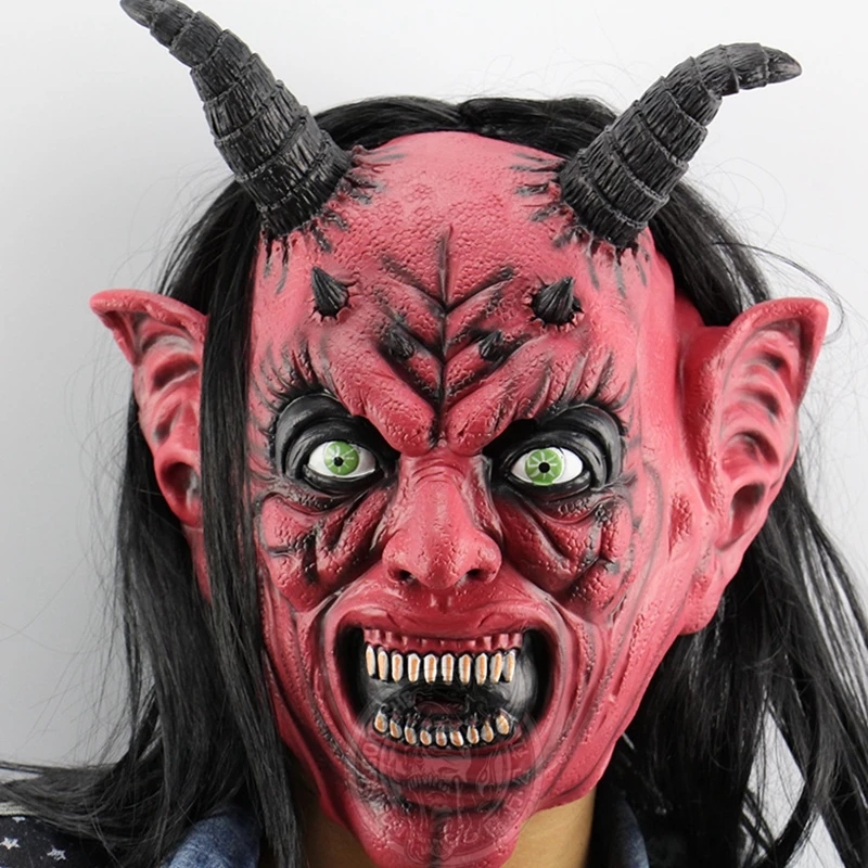 Celohlavová latexová maska čerta s rohama a černými vlasy